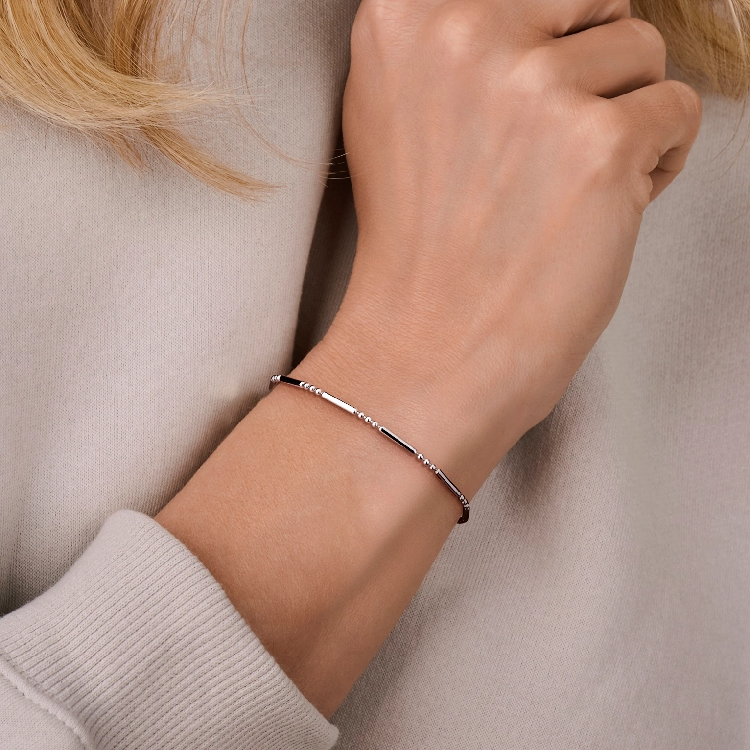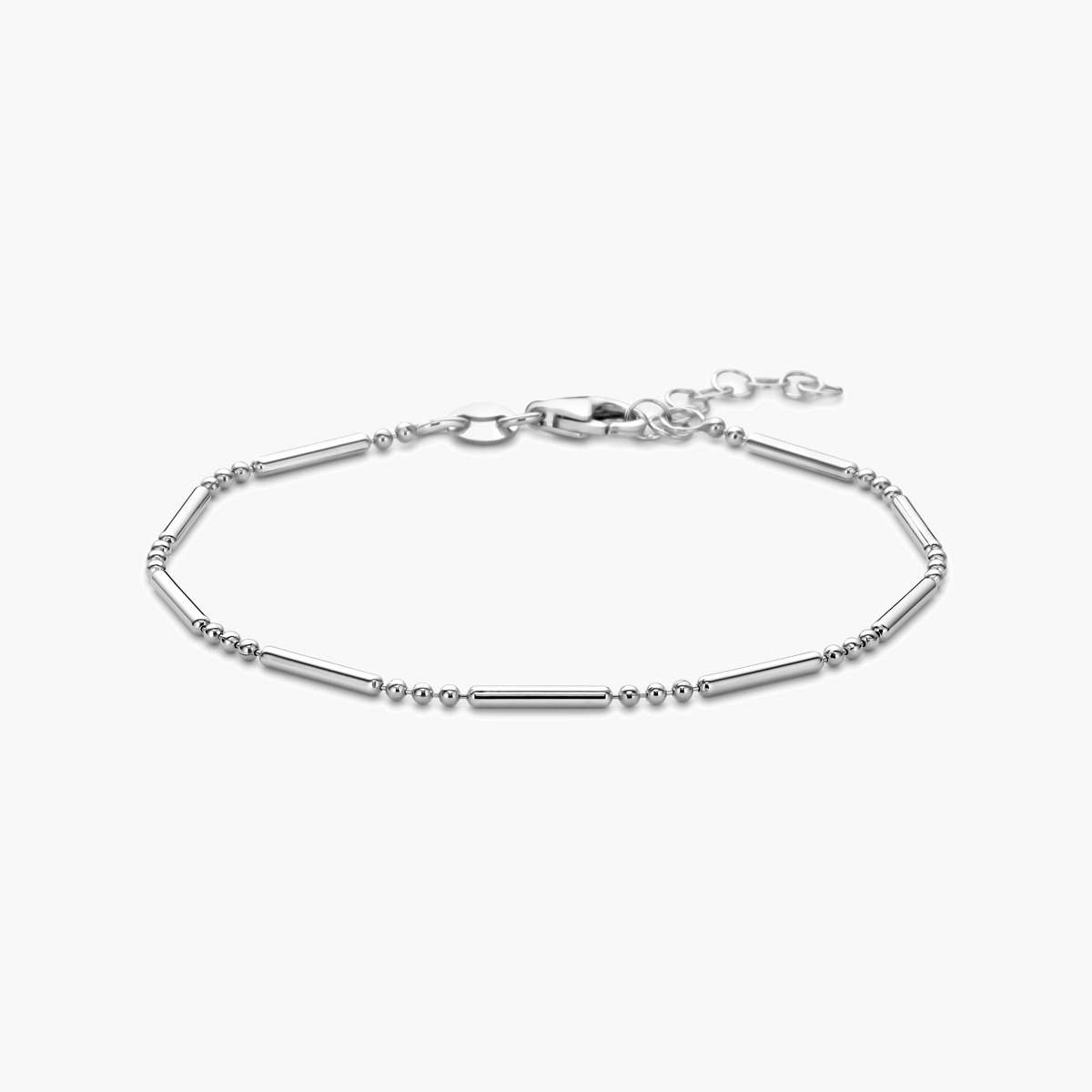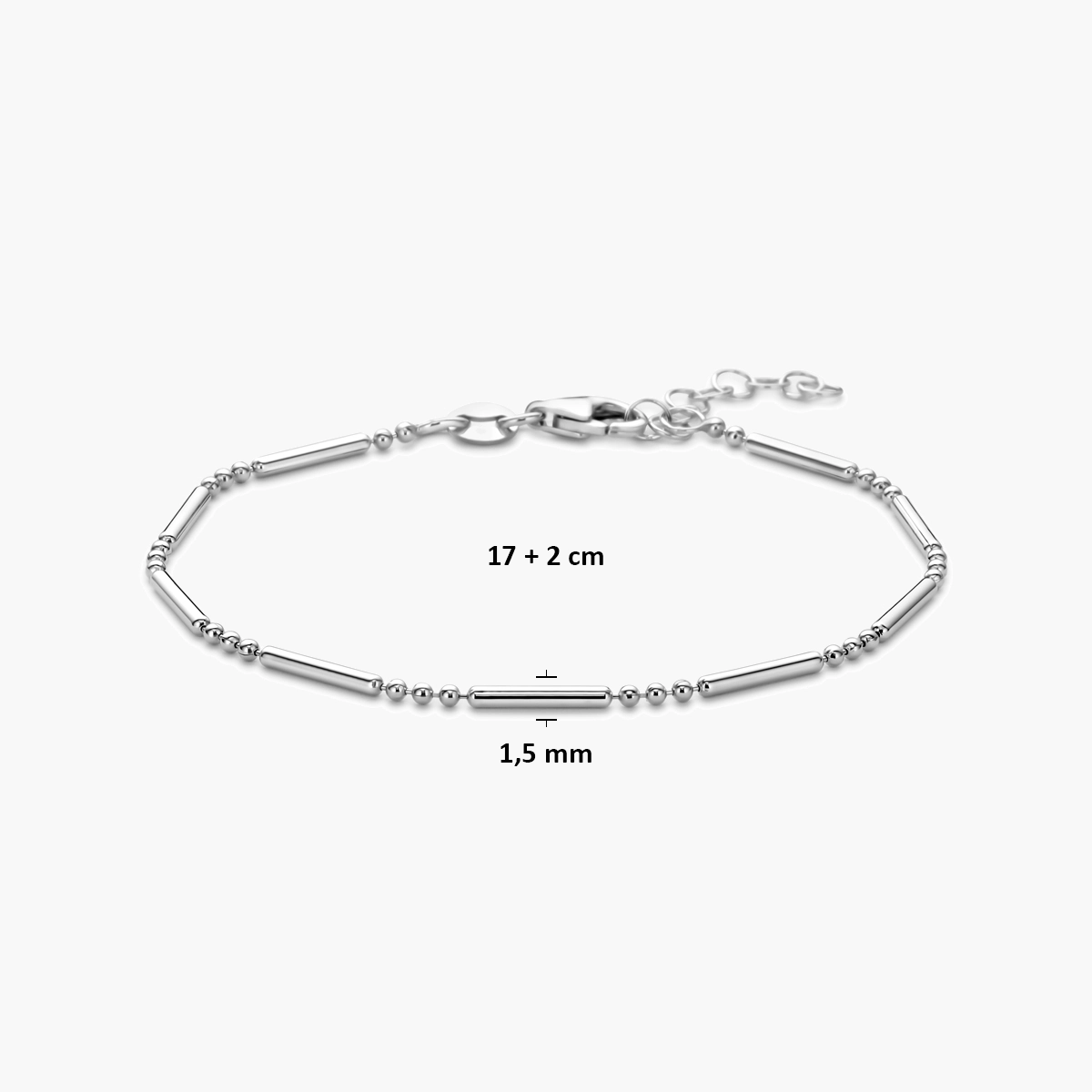 Deze gerhodineerde 925 zilveren armband is uitgevoerd met een afwisseling van staafjes en bolletjes, wat zorgt voor een speels en modern patroon. De schakelbreedte is 1,5 mm, waardoor de armband licht en comfortabel draagt.