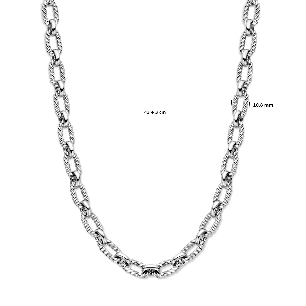 Deze opvallende ketting is uitgevoerd in gerhodineerd 925 Sterling zilver met een brede schakel van 10,8 mm. Het stevige ontwerp met textuur detail geeft de ketting een krachtige uitstraling, terwijl de gerhodineerde afwerking langdurige glans en bescherming tegen verkleuren biedt.