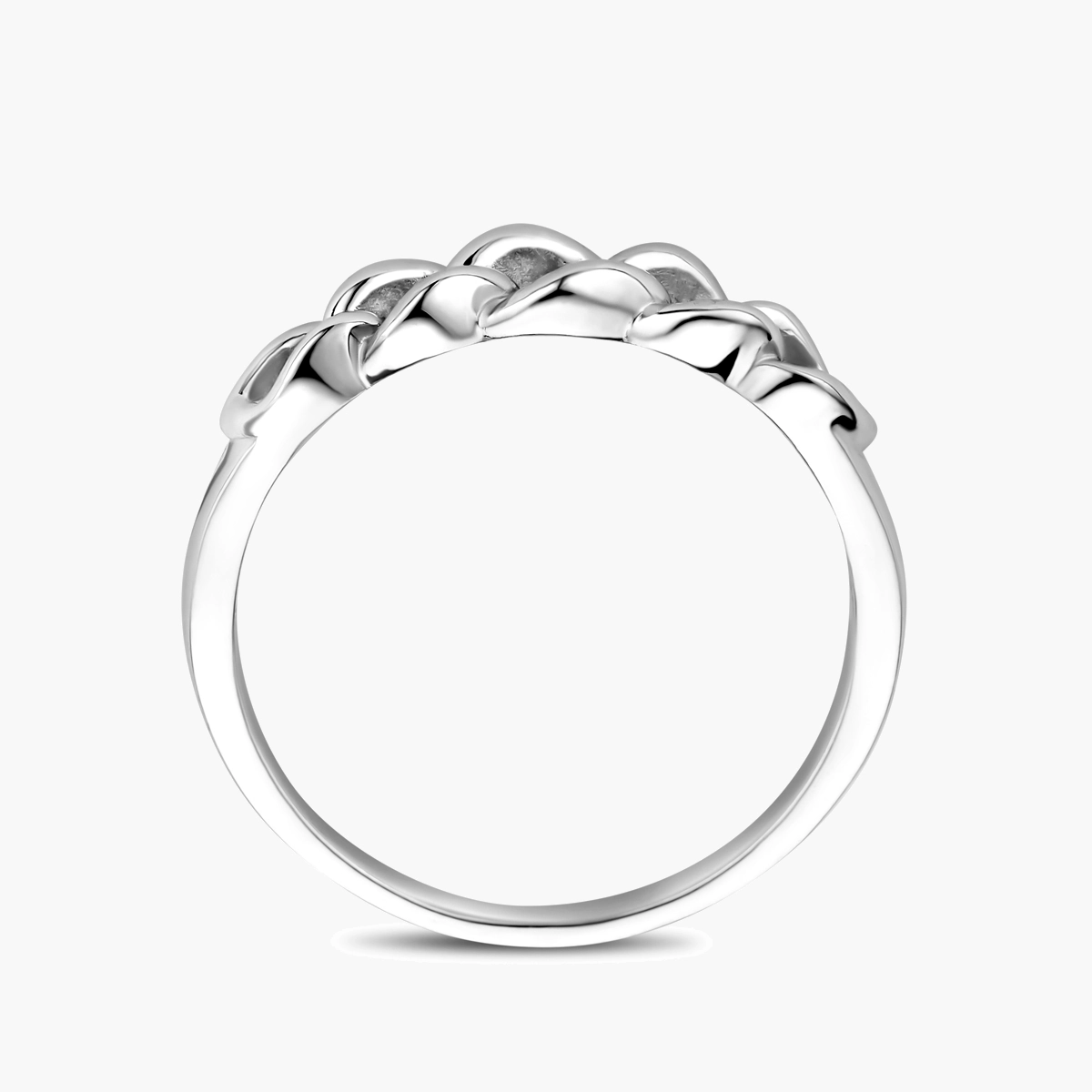 Deze ring is gemaakt van 925 gerhodineerd zilver en heeft een schakelontwerp met een breedte van 6 mm. De schakels geven de ring een stoere uitstraling, terwijl de dunnere breedte aan de achterkant zorgt voor comfortabel dragen. Door het tijdloze ontwerp is hij eenvoudig te combineren met andere sieraden, maar ook solo maakt deze ring een outfit af.