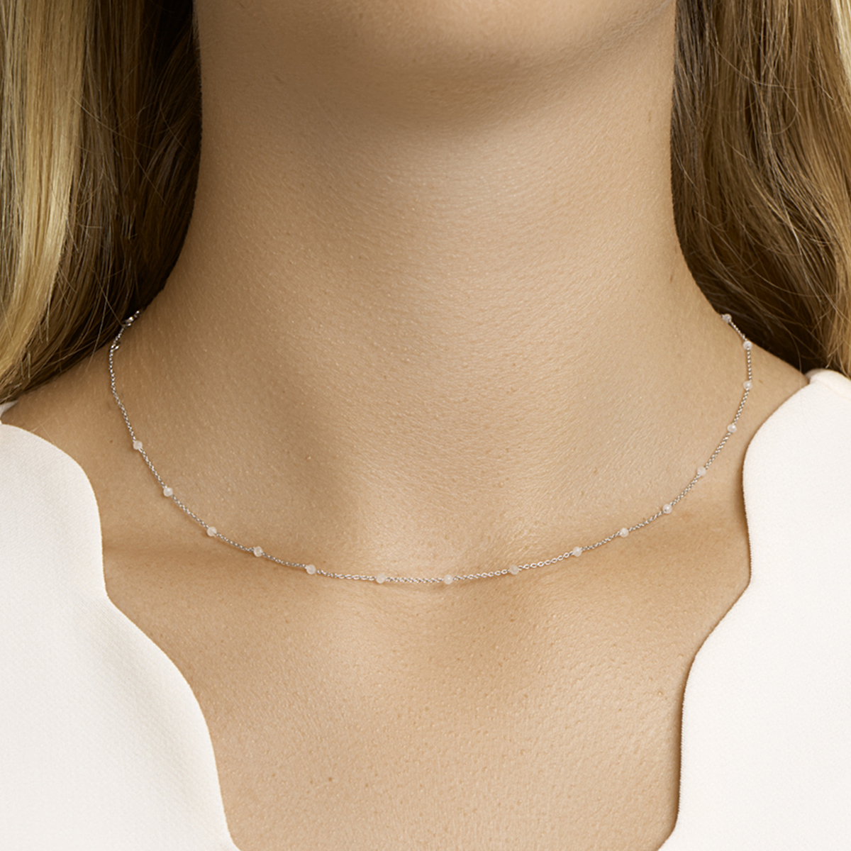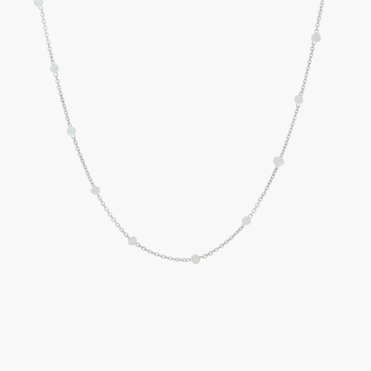 Deze fijne gerhodineerde zilveren ketting is uitgevoerd met kleine witte maanstenen en heeft een verfijnde, subtiele uitstraling. De combinatie van het minimalistische ankerdesign en de facet geslepen maanstenen maakt dit collier perfect voor dagelijks gebruik.