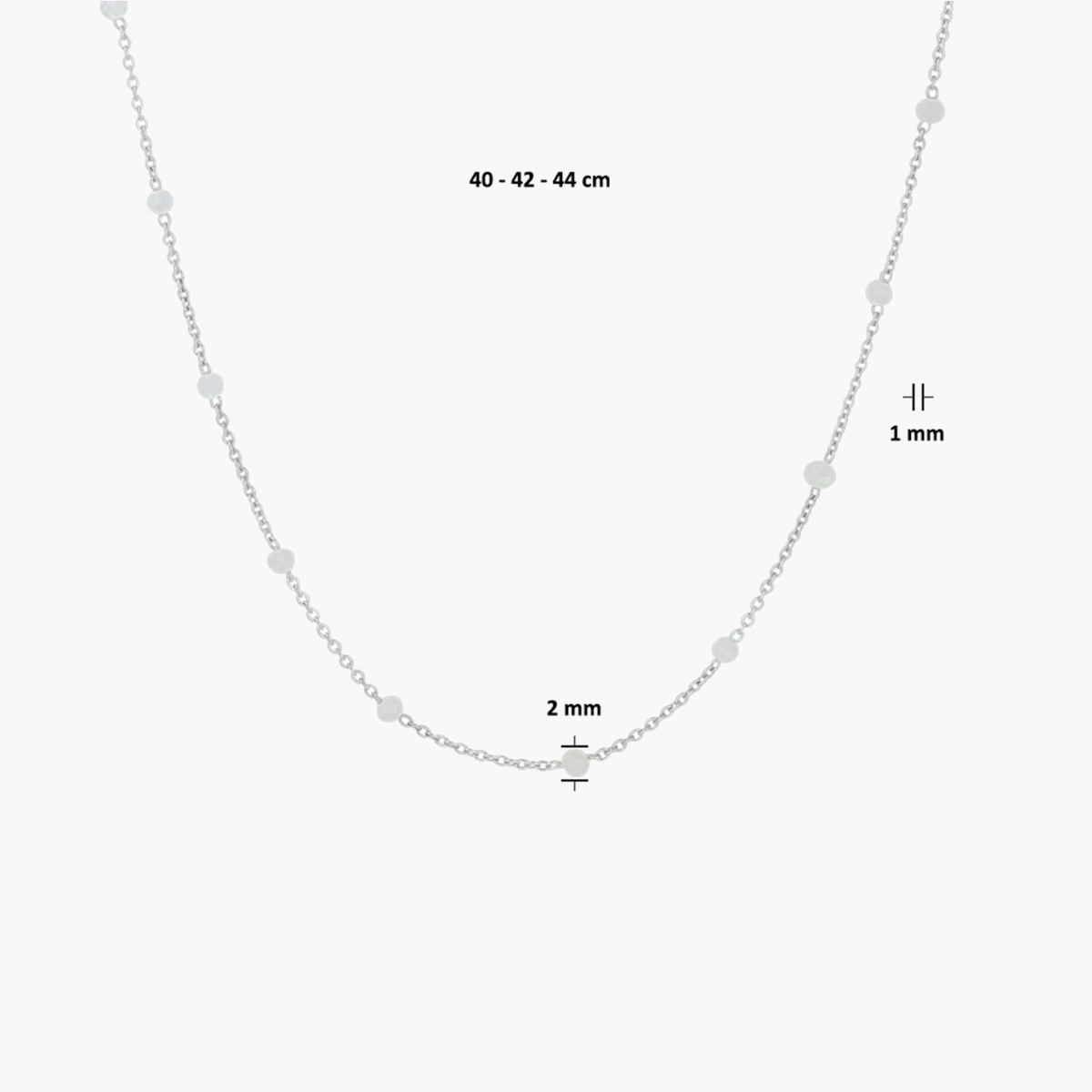 De schakels hebben een breedte van 1 mm, wat zorgt voor een elegante en lichte uitstraling. De maanstenen hebben een diameter van 2 mm en zijn subtiel verdeeld over de ketting voor een speels effect. Dankzij de verstelbare draaglengtes van 40, 42 en 44 cm draag je de ketting precies zoals jij dat wilt.