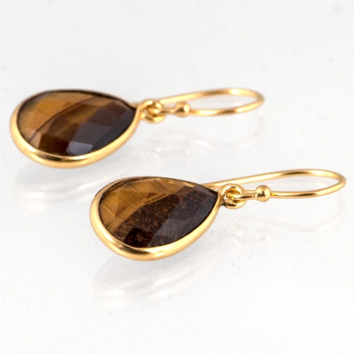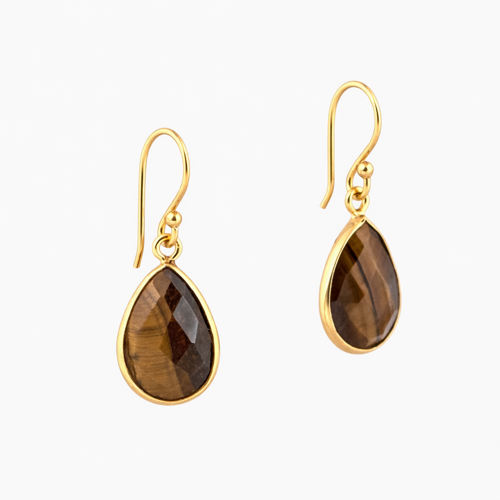 Deze oorbellen zijn uitgevoerd met natuurlijke tijgeroog en gemaakt van verguld 925 Sterling zilver. De facet geslepen stenen hebben een diepe en warme bruin-gouden kleur met een subtiele glans die mooi meebeweegt met het licht.