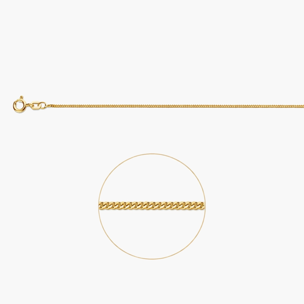 Deze vergulde ketting is vervaardigd uit 925 Sterling zilver en verguld met een duurzame goudlaag. Het gourmet-schakeldesign van 1 mm breed geeft de ketting een verfijnde uitstraling, waardoor hij eenvoudig te combineren is met andere sieraden of als basis voor een hanger kan dienen.