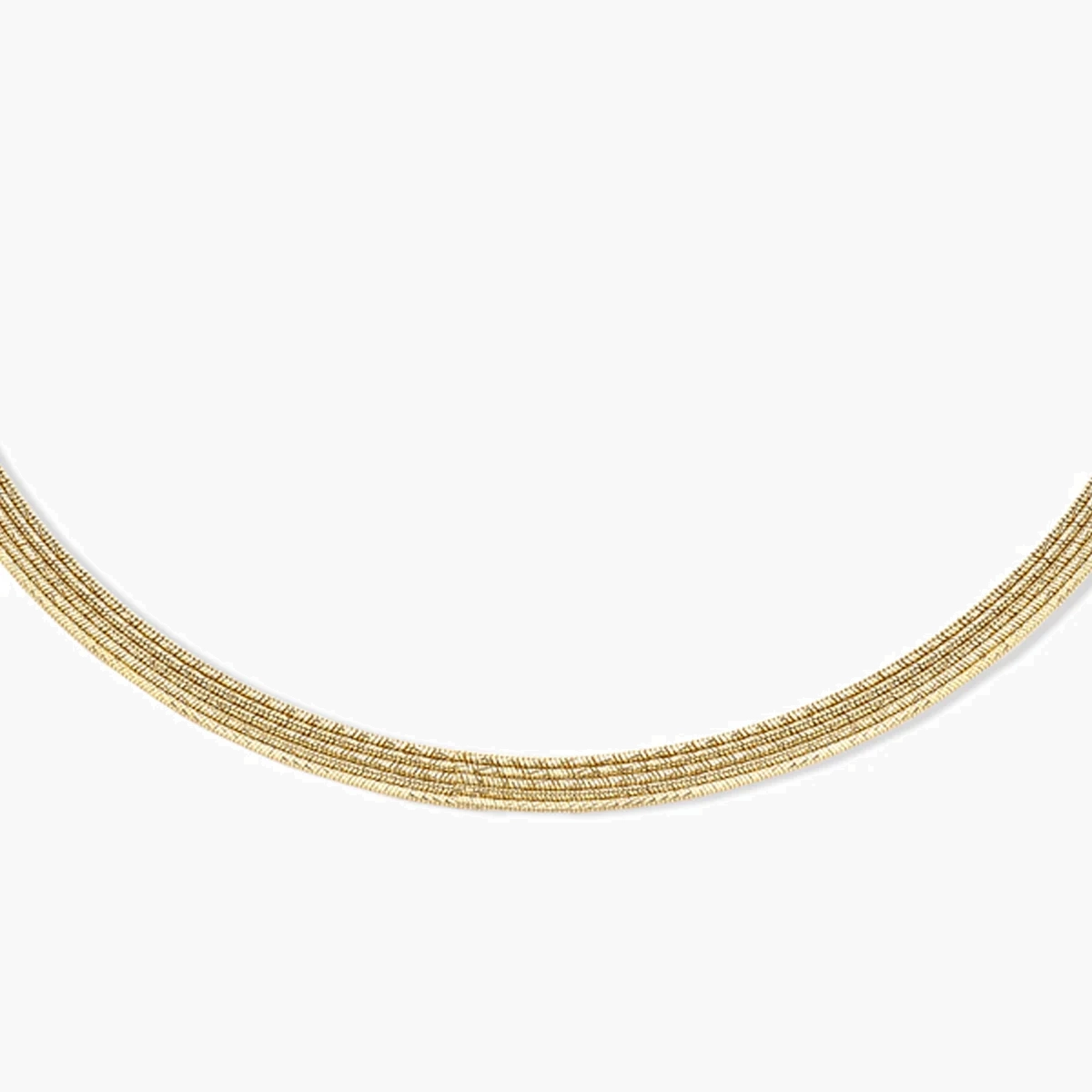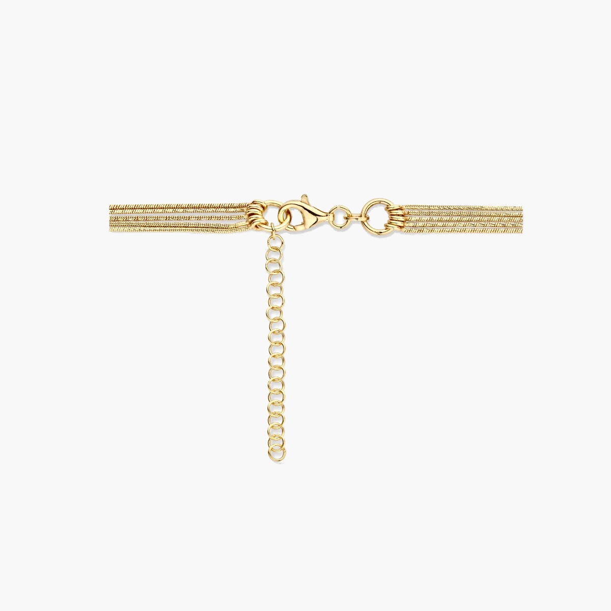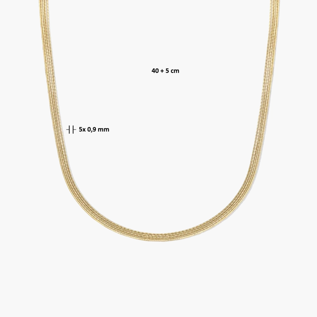 Deze stijlvolle ketting is volledig gemaakt van 925 Sterling zilver en gold-plated met een dikte van 1 micron. Het gepolijste oppervlak zorgt voor een subtiele glans die het sieraad een luxe uitstraling geeft. De ketting bestaat uit vijf fijne kettinkjes – met een schakelbreedte van 0,9 mm – die los van elkaar bewegen en samen een elegant geheel vormen.