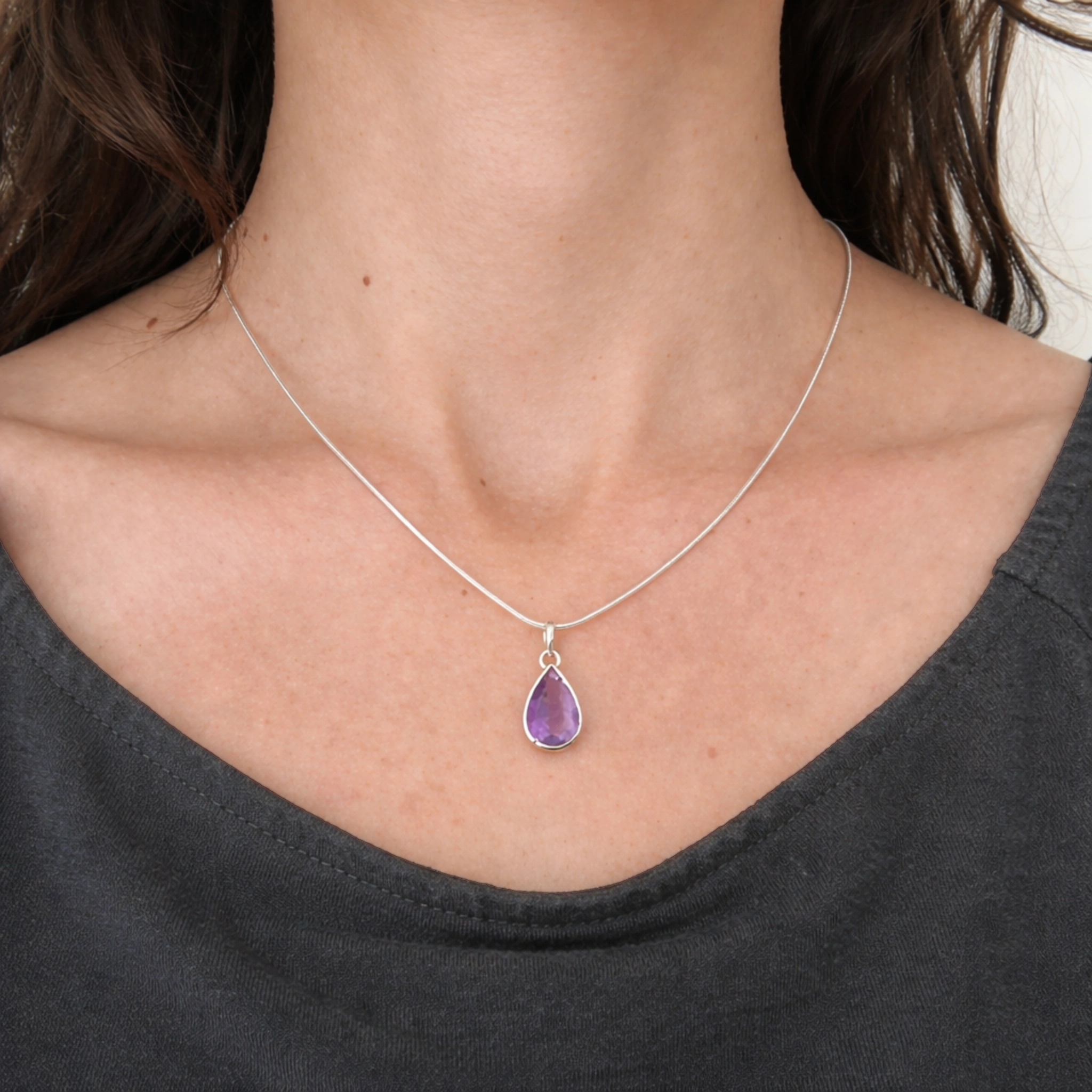 Deze hanger is gemaakt van 925 Sterling zilver en voorzien van een prachtige, facet geslepen paarse Amethist. De hanger heeft een open achterkant, een lengte van 21 mm (inclusief oogje) en een breedte van 9 mm. De hanger wordt standaard zonder ketting geleverd. De ketting op de foto aan de hals is de zilveren slang ketting van 1,2 mm breed.