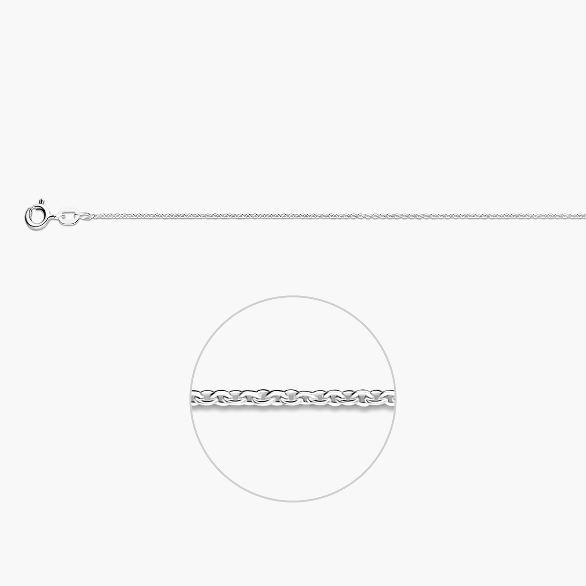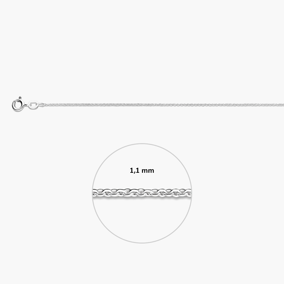 Deze zilveren uniseks ketting is uitgevoerd met een fijne ronde anker schakel en gemaakt van 925 sterling zilver. De ketting heeft een schakelbreedte van 1,1 mm en een stevige veersluiting.